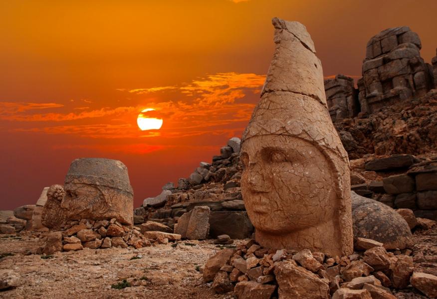 Adıyaman’ın Kahta ilçesinde dileyen misafirlerimiz ile bizleri bekleyen minibüslerimize binerek Nemrut Dağı turumuza başlıyoruz(Ekstra). İlk durağımız olan Kommagene Kralı Mithridates ve ailesinin mezarlarının bulunduğu Karakuş Tümülüsü’ne ulaşıyoruz. Muhteşem manzara eşliğinde rehberimizin yapacağı anlatımların ardından minibüslerimize binerek Roma döneminin en görkemli köprülerinden birisi olan Cendere Çayı üzerine inşaa edilmiş 18 asırlık Cendere Köprüsü’ne varıyoruz. Burada fotoğraf molası verdikten sonra Doğu Toros sıra dağları üzerinde 2150 metre yüksekliğindeki Nemrut Dağı'na tırmanışa geçiyoruz. Zirvede 2150m’de Kral I. Antiochos’un Tümülüsü yer almaktadır. Doğu ve batı teraslarında I. Kral Antiochos tarafından yapılmış Zeus (Oromasdes), Apollon, Mithras, Helios, Hermes, Herakles, Artagnes, Ares, Kommagene, Tiche ve kendisinin dev heykelleri bulunmaktadır. Kral I. Antiochos, bir araya getirdiği Yunan-Pers din ve kültürünü, geleneklerini bu eserlerde açık bir şekilde pekiştirmiştir. Rehberimizden gerekli bilgileri aldıktan sonra Antiochos'un şu vasiyetini hatırlayarak eşsiz manzarasının keyfini çıkartıyoruz; “Doğum günüm her ay ve yıl kutlanıp, bayram günü olacak, bu günlerde baş rahip, tanrılar ve benim için kendisine benim ve kanunların cömertçe verdiği Pers kılığına bürünerek hepimizin üzerine altın çelenkler koyacak. Hepimiz için bol bol kokular yakacak ve gereğince kurbanlar kesecek, kutsal sofraları en güzel yemekler ve şaraplarla donatacak. Buraya toplanan ulusum, bol bol yiyip bayram edecek.”