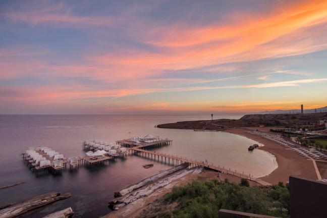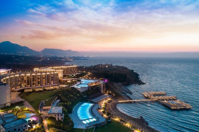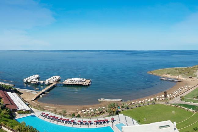 1,3 km uzunluğundaki sahil şeridinde, tesisin 650 m uzunluğunda ince kumlu özel plajı bulunuyor. Plajda, havuzda ve iskelede şezlong, şemsiye, havlu ve minder ücretsiz. Tesisin 3.250 m² büyüklüğünde iskelesi mevcut. İskelede 25 adet pavillion ve İskele Deep Bar hizmet veriyor.
